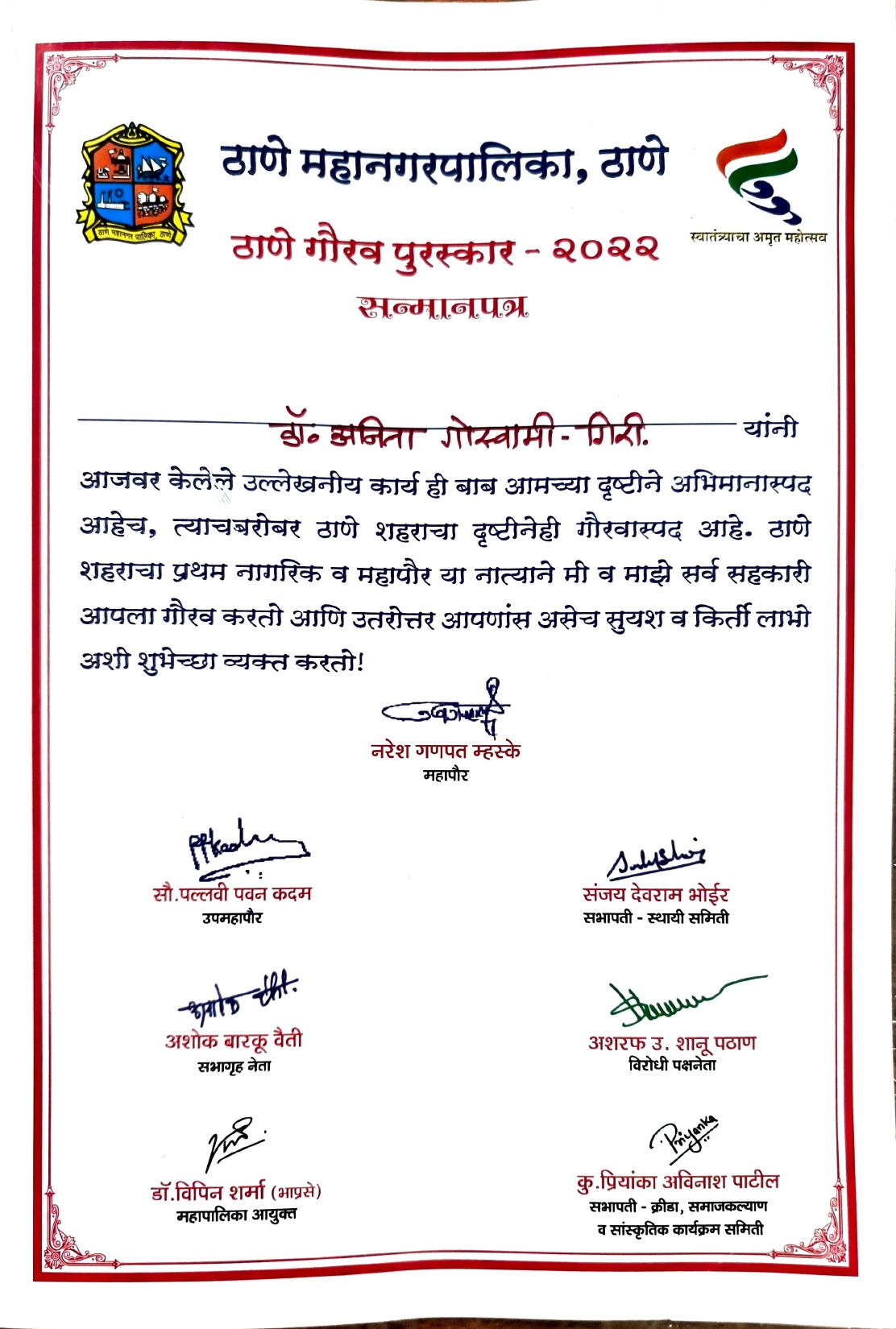 Thane Gaurav Puraskar 2022 to Dr. Anita Goswami-Giri