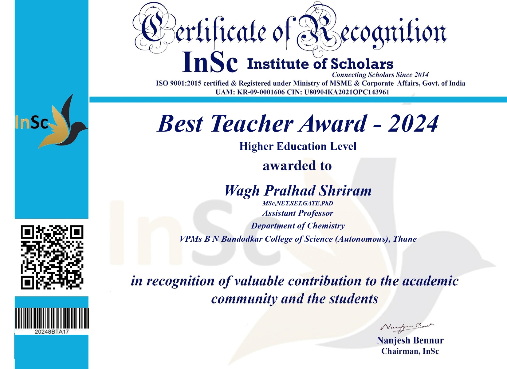 Best Teacher Award 2024 to Dr. Pralhad S. Wagh