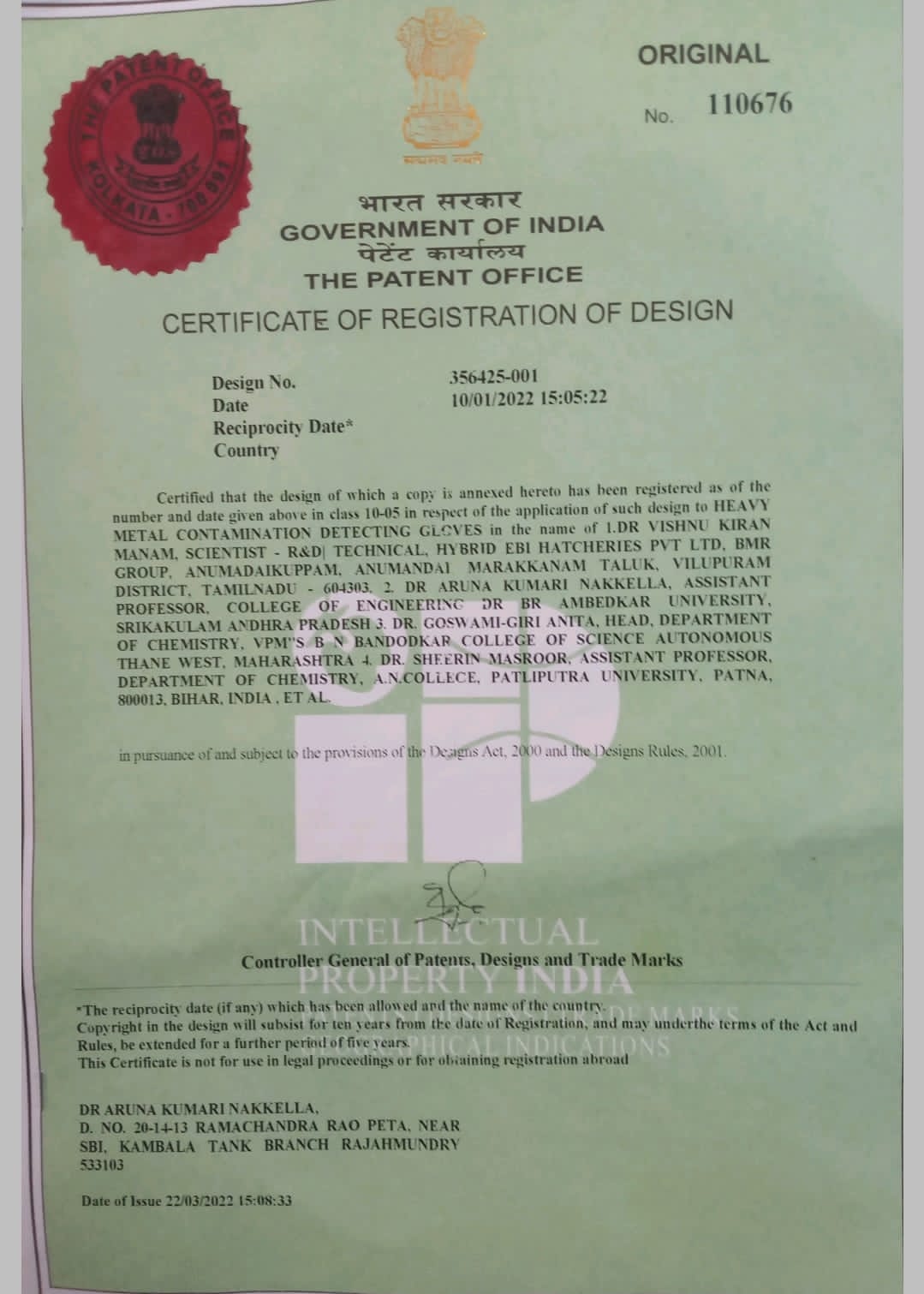 14 | Dr. A. S. Goswami-Giri | A heavy metal contamination detection using cusomized wearable gloves | Grant, IP desigend patent: 356425-001 | More | |