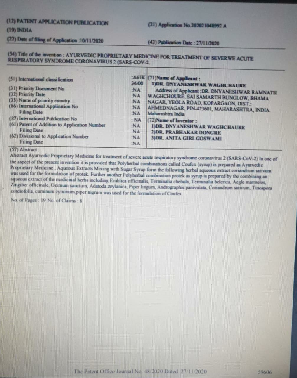 7 | Dr.Goswami -Giri Anita | AYURVEDIC PROPRIETARY MEDICINE FO TREATMENT OF SEVERE ACUTE RESPIRATORY SYNDROME CORONA VIRUS II (SARS-COV-2) | Application no- 202021048992 27/11/2020 | More | |