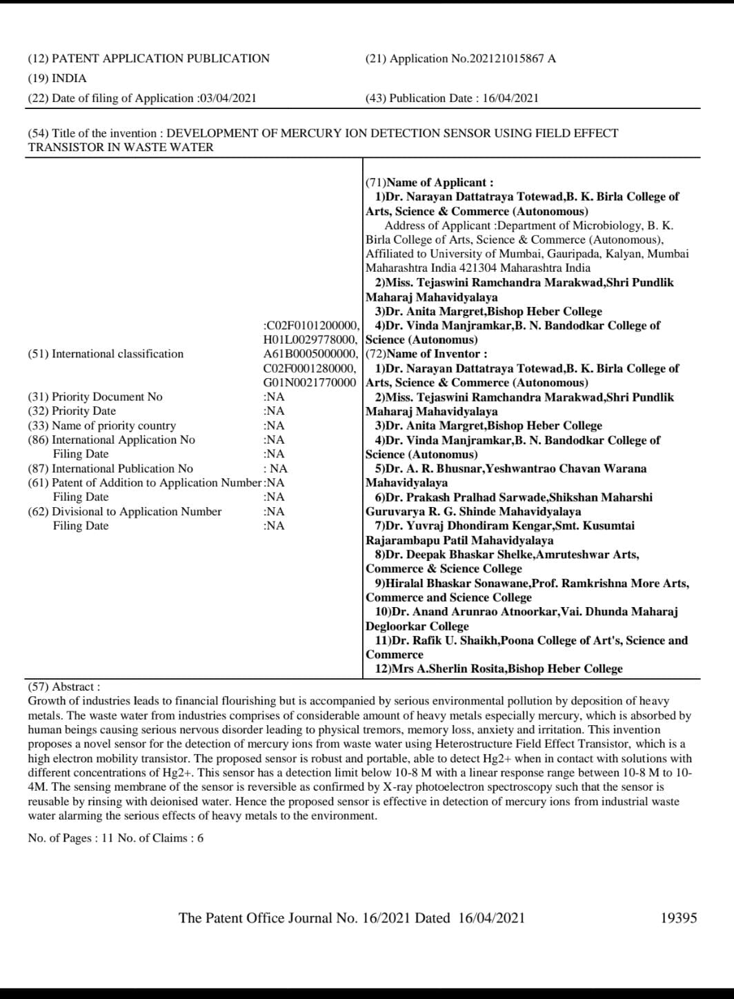 16 | Dr. Vinda Manjramkar | DEVELOPMENT OF MERCURY ION DETECTION SENSOR USING FIELD EFFECT TRANSISTOR IN WASTE WATER | IP 2021210158674 | More | |