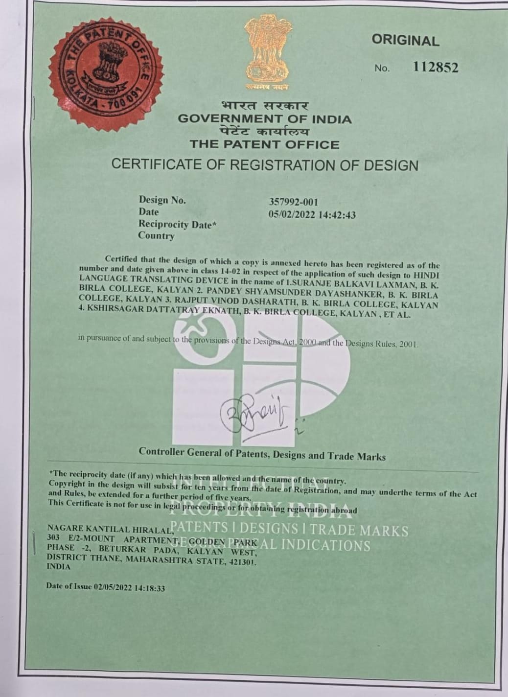 12 | Dr. Vinda Manjramkar | Hindi language translating device. | IP: 357992-001 | More | |