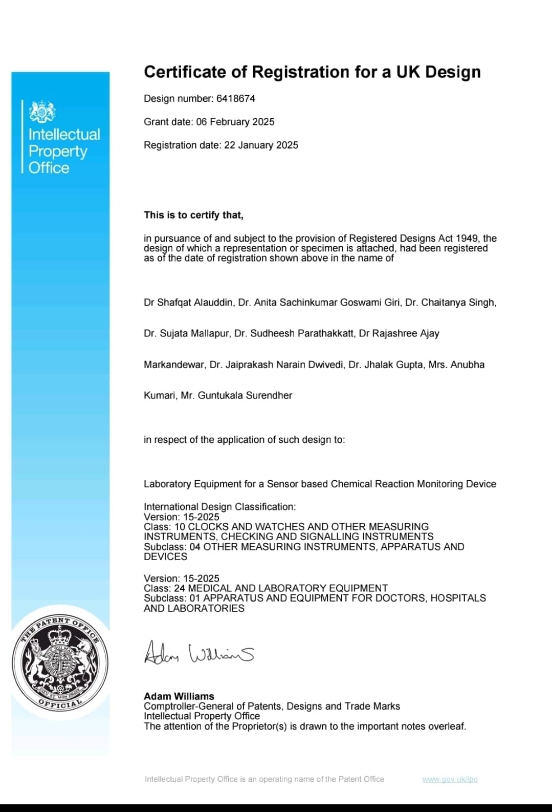 | 31 | Dr. Anita Goswami-Giri | Laboratory equipment for a Sensor Based on Chemical reaction monitoring device. | Application Number: 6418674 06/02/2025 | More | |